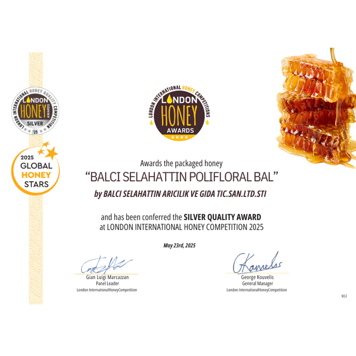 Farklı çiçek türlerinin nektarlarından elde edilen bu özel bal, zengin aroması ve dengeli tadıyla öne çıkar. Balcı Selahattin poli floralı çiçek balı, Londra Uluslararası Bal Yarışması’nda Gümüş Madalya kazanarak kalitesini dünya çapında kanıtlamıştır. 📄 Ödül sayfasını görüntüle